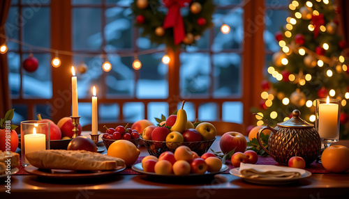 Warm Christmas Eve table setting featuring red and yellow fruits candlelight cozy ambiance