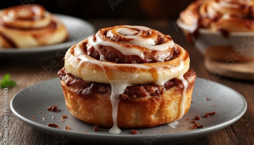 Warm cinnamon roll covered in sweet glaze, sitting on weathered ceramic plate with enticing golden brown swirls and delicate sugar drizzle