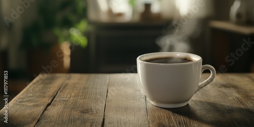 Warm Coffee Cup on Rustic Wooden Table with Steam Rising
