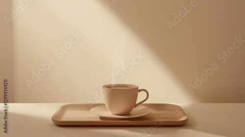 hot drink, cup, mug, tea, drink, hot, steam, warm, sunlight, light, shadow, tray, wooden, beige, brown, pastel, calm, serene, minimalist, simple, clean, cosy, comfort, morning, relaxation, peace, quiet, home, interior, still, life, scene, background, texture, design, aesthetic, style, image, photo, illustration, render