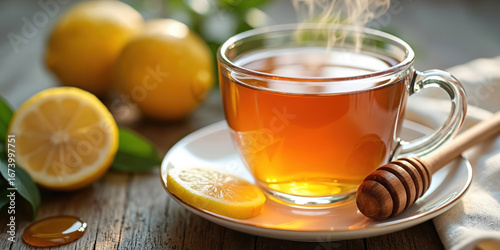 Warm cup of amber tea with lemon slices and honey on rustic wooden table. Steam rises, indicating hot beverage perfect for cold and flu relief. Natural remedy for comfort and recovery.