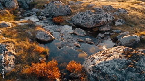 Warm evening light illuminating a tranquil stream winding through large stones and dry vegetation in a serene natural landscape aerial view