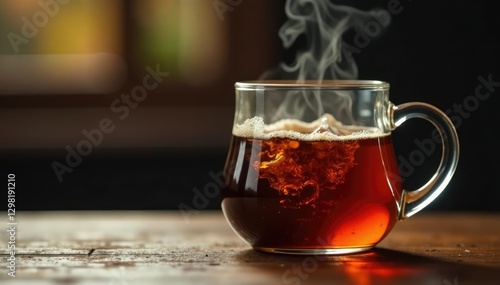 Warm glass container filled with steaming dark liquid, brown, warm, glass