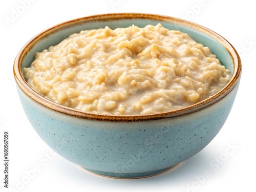 Warm hearty bowl of creamy oatmeal prepared with oats and milk healthy breakfast food white background