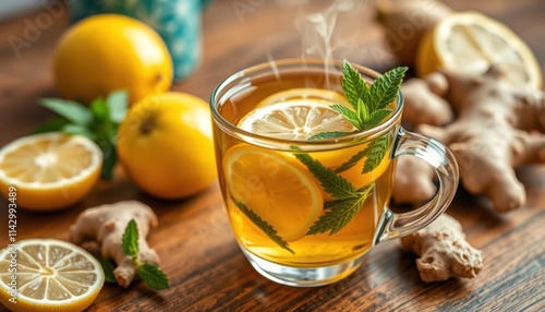 Warm herbal tea with lemon, ginger served in transparent glass cup. Fresh mint leaves, lemon slices on top of tea. Natural ingredients like ginger, lemon on wooden surface. Refreshing, healthy drink.
