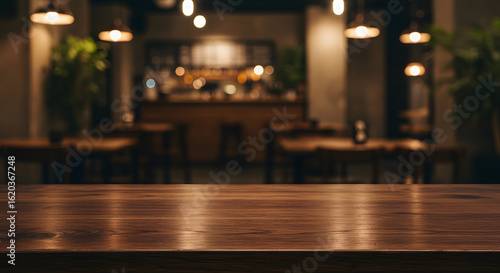 Warm, Rustic Wooden Tabletop in a Blurred Cozy Cafe Setting; Evening Ambiance
