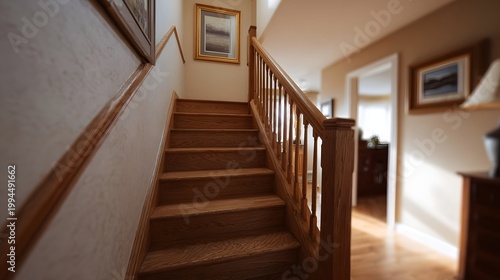 staircase, interior, home, architecture, wood, banister, railing, step, indoor, passage, hallway, domestic, natural, light, modern, rustic, elegant, comfortable, design, cosy, staircase, floor, hardwood, wall, residential, depth, perspective, angle, clean, empty, frame, artwork, picture, gallery, illumination, structure, vertical, ascent, descent, warmth, inviting, detail, nobody, dwelling, lifestyle, craftsmanship