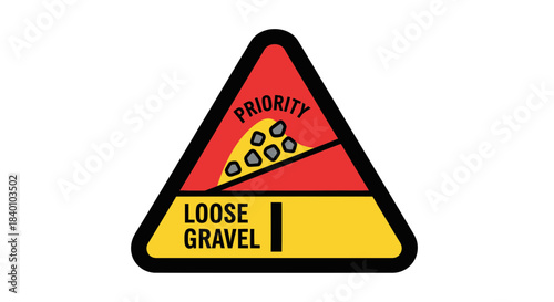 warning, hazard, signage, danger, risk, loose, gravel, road, transportation, safety, construction, caution, traffic, alert, environment, driving, surface, ground, material, particle, stone, pebble, uneven, slippery, trail, pathway, obstacle, problem, vigilance, watch, awareness, protection, accident, prevention, instruction, symbol, triangle, red, yellow, black, vector, illustration