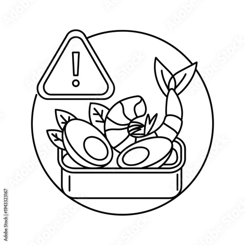 warning, danger, caution, alert, food, shrimp, prawn, avocado, canned food, seafood, allergy, allergen, risk, hazard, dietary, restriction, intolerance, health, nourishment, safety, icon, symbol, illustration, outline, line art, graphic, design, label, notice, prohibited, forbidden, ingredient, component, contamination, unhealthy, consumption, preparation, fresh, healthy eating, diet, organic, epicure, receipe, food processing, food industry