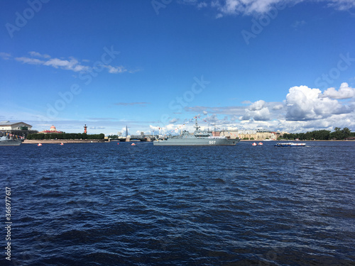 Warships in the waters of the Neva river, which arrived to participate in the naval parade in St. Petersburg against the background of a bright blue sky with clouds.