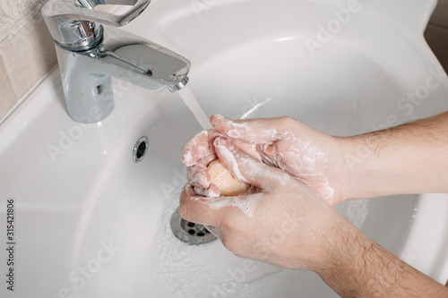 Wash hands under the tap with soap. Hygiene concept in detail. Beautiful stream of hands and water in the bathroom.