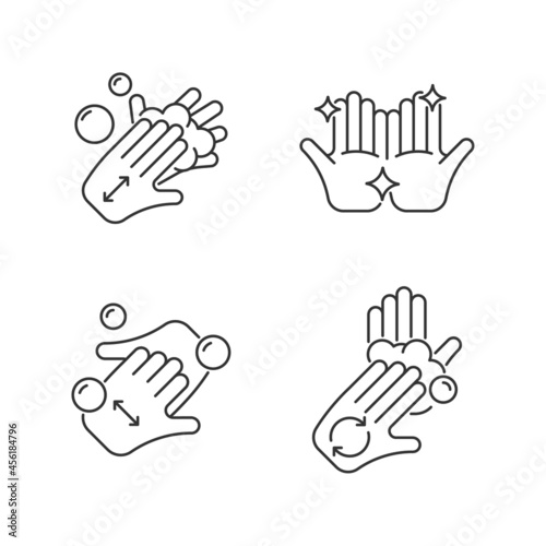 Washing hands instruction linear icons set. Rubbing palms together with soap. Cup fingers. Customizable thin line contour symbols. Isolated vector outline illustrations. Editable stroke
