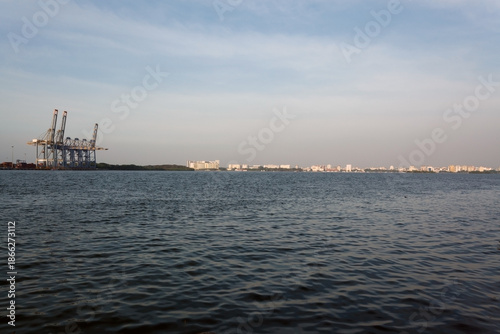 Wasserweg, Blick auf die Skyline von Kochi, Ernakulam, Containerhafen, Hafen, Vembanad Lake,