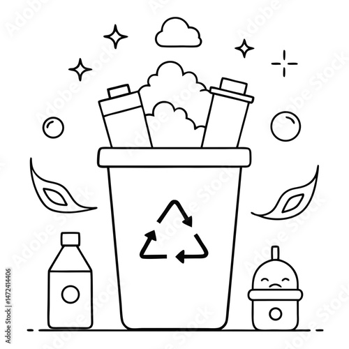 Waste Recycling Concept Outline for Environmental Coloring Book Page Featuring Eco-Friendly and Sustainability Elements