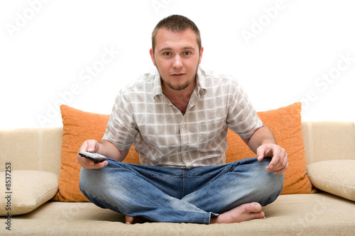 man, television, watching, watch, sofa, home, couch, remote, control, adult, brown, buttons, casual attire, caucasian, grooved, comfortable, entertainment, expression, happy, interior, joy, laziness, leisure, living, looking, male, motion picture, 1, people, person, picture, relax, relaxation, room, sitting, sport, television, video, view, white, young, youth
