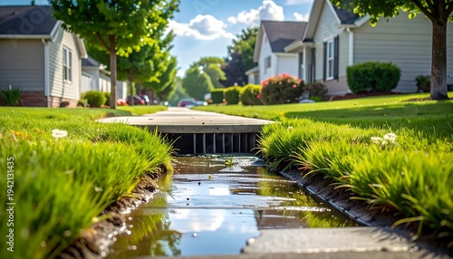 drainage, water, grass, ditch, neighbourhood, house, lawn, green, residential, stream, flow, summer, sunny, clear, sky, cloud, landscape, suburb, home, property, street, grooved, concrete, culvert, environment, nature, plant, surface, calmness, suppressing, yard, foliage, pathway, gutter, urban, community, daylight, exterior, garden, ground, lawn
