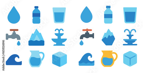 drink, water, water bottle, tap, iceberg, fountain, pitcher, ice cube, contemporary, flat, geometric, graphic, minimal, rounded, isolated, vector, modern, filled, simple, uniform, playful