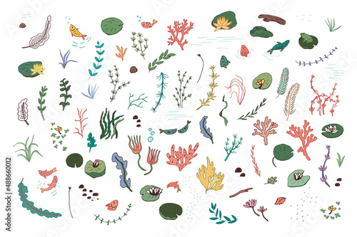 illustration, vector, plant, water, seaweed, abstract, algae, algae, aquarium, aquatic, art, background, beach, botanical, coral, decoration, decorative, design, doodle, drawn, element, exotic, fish, flora, floral, flower, graphic, hand, lake, leaf, leaf, line, marin, nature, ocean, outline, river, sea, set, style, summer, textile, texture, tropical, undersea, underwater, vintage, wildlife