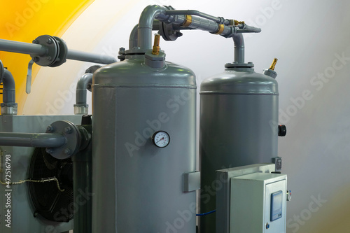Water purification equipment. Gray cylinders for water cleaning. Water purification system at the enterprise. Gray balloon with pressure sensor. Industrial liquid purification system.