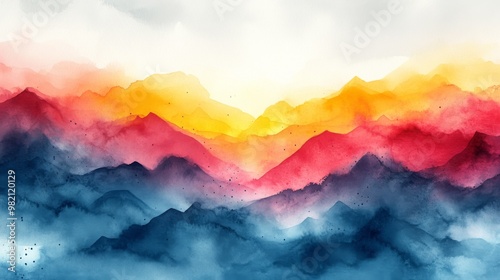 watercolor, abstract, mountain, landscape, art, painting, red, yellow, blue, nature, sky, horizon, fog, mist, hill, peak, range, layer, gradient, colourful, high-coloured, vibrant, artistic, texture, background, design, illustration, pattern, beauty, calmness, serenity, peace, harmony, dreamy, inspiration, imagination, creative