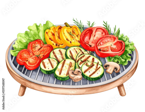 Watercolor barbecue grill with fresh vegetables including zucchini, bell peppers, tomatoes, mushrooms and herbs being grilled