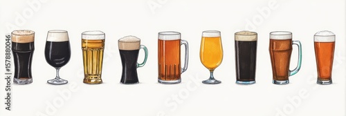 Watercolor beer glasses set on whte background. Isolated different kinds of beer glasses.