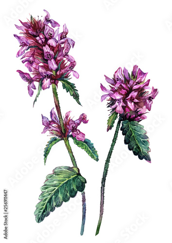 watercolor, botanical, flower, betony, purple, pink, floral, herbal, medicine, vintage, detailed, realistic, illustration, isolated, white, bouquet, art, painting, drawing, leaf, bud, bloom, blossom, wildflower, wild, meadow, nature, summer, spring, bungalow, garden, background, design, decoration, plant, decorative, green, natural, gardening, flora, painted, field, botany, element, herb