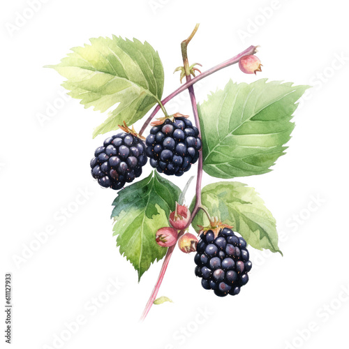 watercolor Blackberries and bramble, in illustrated-themed, photorealistic illustrations in a PNG, cutout, and isolated. Generative AI
