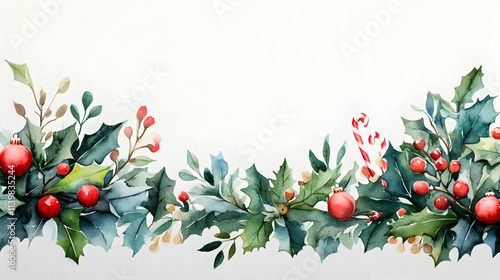 christmas, holly, berry, leaf, candy, cane, watercolor, winter, festive, holiday, decoration, design, illustration, background, border, frame, red, green, white, nature, plant, tree branch, celebration, season, greeting, card, invitation, template, pattern, artwork, painting, image, graphic, element, texture, style, art, visual, composition, seasonal, traditional, ornament, arrangement, botanical