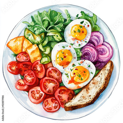 watercolor, clip art, vibrant, breakfast, platter, artistic, food, hand-painted, creative, unique, detailed, bright, simple, minimalistic, culinary, morning, meal, colourful, delicious, variety, tasty, epicure, selection, dish
