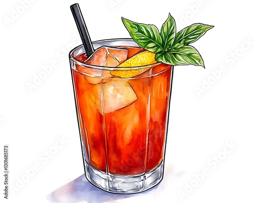 Watercolor cocktail in glass with ice, lemon, basil, white background, ideal for drink menu