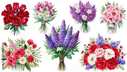 Watercolor Collection of Various Flower Bouquets Roses Tulips Lilacs Carnations Daisies