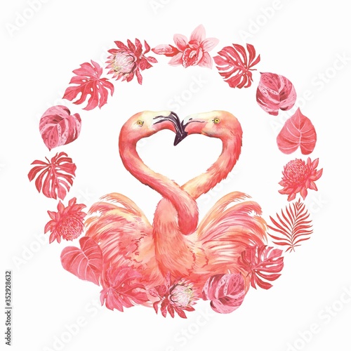 Watercolor decorative illustration of pink flamingos with tropical flowers, cute couple of flamingos, tropical frame.