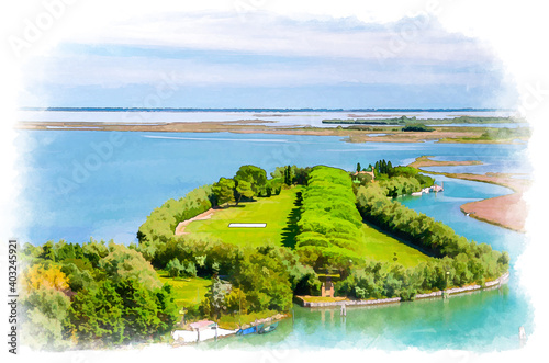 Watercolor drawing of Aerial view of Torcello islands swamp, water canal and green trees alley and bushes. Panoramic view of Venetian Lagoon