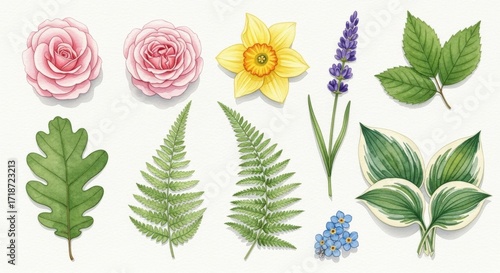 flower, flower, rose, rose, daffodil, narcissus, lavandula, leaf, leaf, fern, foliage, botanical, watercolor, illustration, painting, art, nature, spring, summer, garden, floral, bloom, blossom, green, pink, yellow, purple, blue, white, design, element, decorative, isolated, plant, flora, drawing, artistic, elegant, fresh, vibrant, detail, beauty, natural, hand-drawn, graphic, arrangement