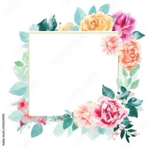 watercolor, floral, frame, white, background, simple, design, flat, vector, graphic, element, style, hand, painted, pastel, pink, green, tone, delicate, leaf, flower, edge, empty, rectangle, front, adorned, vibrant, rose, peony, daisy, colourful, bloom
