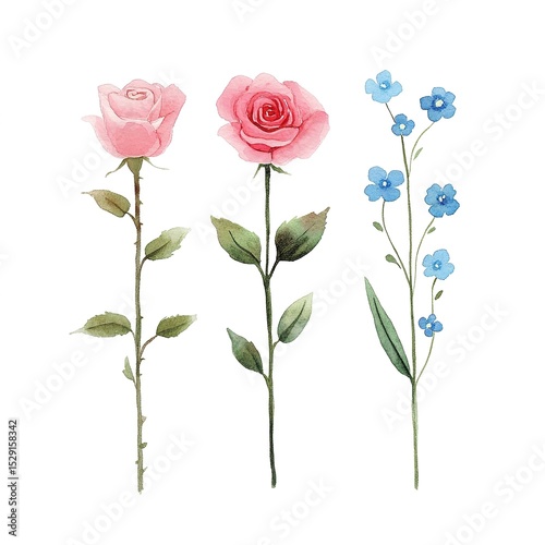 floral, rose, flower, pink, blue, painting, illustration, botanical, design, art, pretty, beautiful, spring, summer, nature, stem, leaf, bouquet, arrangement, artistic, delicate, garden, flower, stem, flower petals, isolated