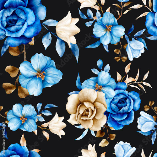 Watercolor floral seamless pattern with blue and brown flower and leaves