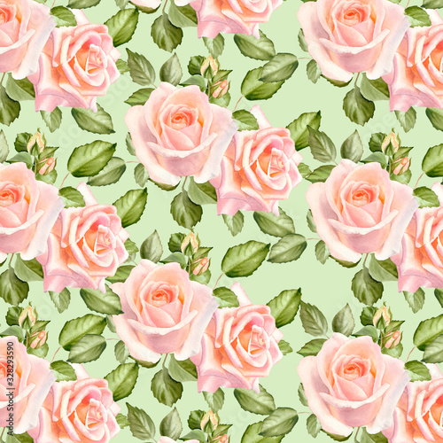 Watercolor floral seamless pattern with rose flowers and green leaves isolated on white background. Hand painted print for textile design and decoration.