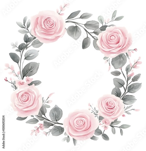 Watercolor floral wreath, with roses and pink flowers, leaves, and eucalyptus clipart, on a white background