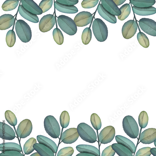 Watercolor frame of green tropical branches. Hand painted floral border with tree branches isolated on white background.