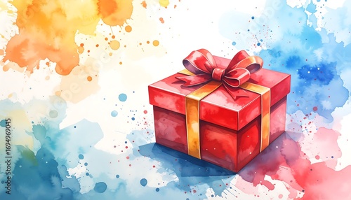 gift, box, red, ribbon, bow, watercolor, splash, paint, abstract, art, graphic, present, celebration, happy, joy, decoration, artistic, colours, design, illustration, shape, square, bright, warm, cool, background, palette, joyful, colourful, modern, visual, image, creative