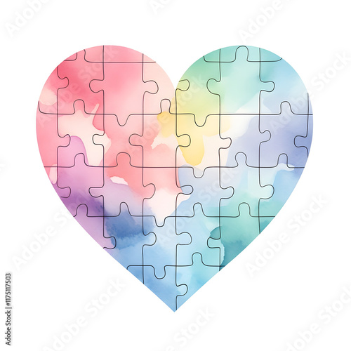 Watercolor Heart Puzzle with Soft Pastel Tones, Symbolizing Unity and Connection on White Background