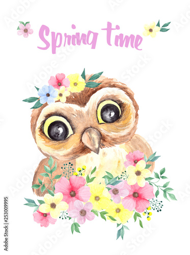 Watercolor illustration cute owl and spring flowers