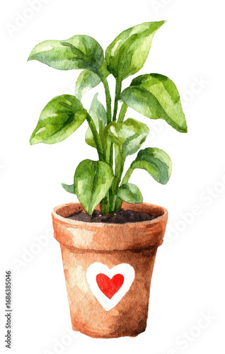 Watercolor illustration of a small potted plant. A terracotta-colored pot contains a lush, leafy plant with vibrant green leaves. A white heart is painted on the pot