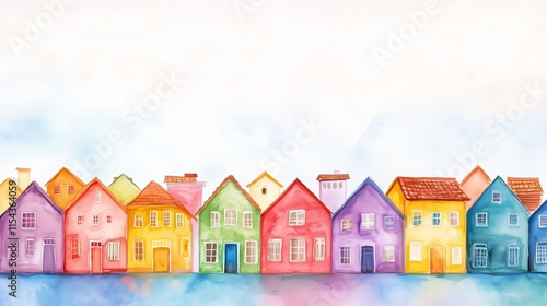 Watercolor illustration of colorful houses in a row with soft gradients, banner