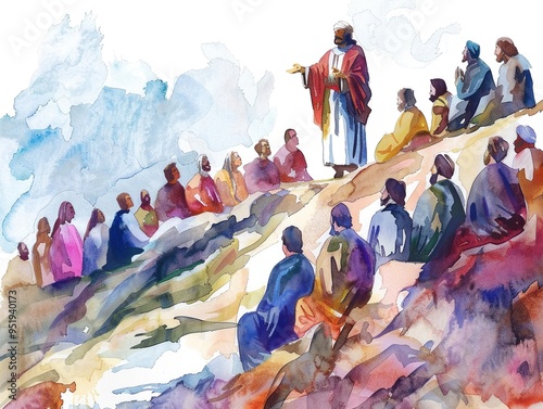 watercolor, illustration, sermon, mount, capture, essence, jesus christ, instructing, simplify, serene, peaceful, fine, design, divine, graphic, kindness, clip art, bible, scene, true, sacred, artwork, praise, saviour, scripture