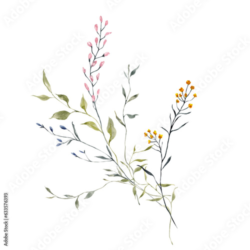 Watercolor illustration with wildflowers, herbs, grass and green leaves, isolated on white background