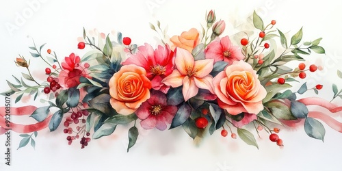 watercolor, painting, art, floral, arrangement, rose, rose, berry, berry, greenery, green, leaf, leaf, flower, flower, bloom, blossom, flower petals, stem, tree branch, bud, pink, red, orange, white, background, illustration, design, nature, beauty, delicate, elegant, romantic, botanical, artistic, colourful, vibrant