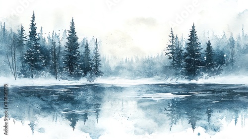 Watercolor painting of a snowy winter landscape with pine trees and a frozen lake.--ar 16:9